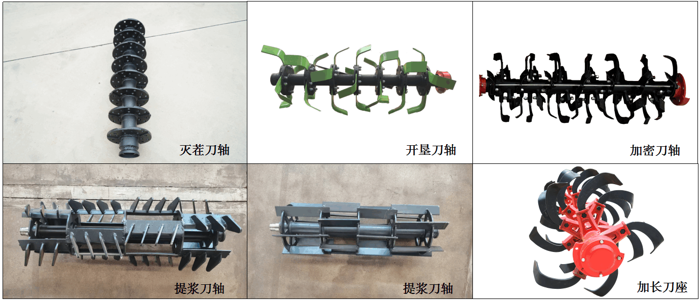 可根據(jù)水旱田及農(nóng)藝需要配制:滅茬刀軸、開墾刀軸、提漿刀軸、加密刀軸、提漿刀軸、加長(zhǎng)刀座