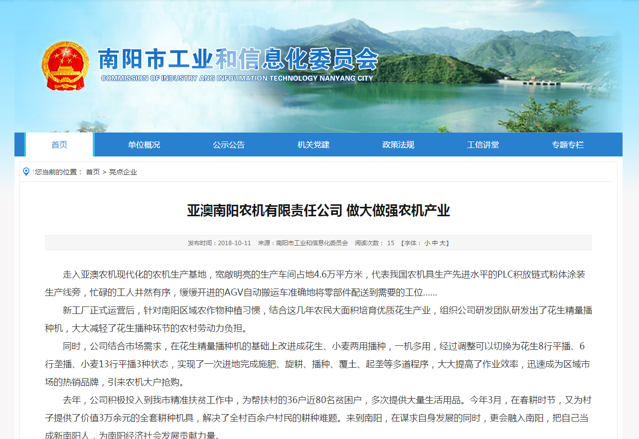 走入亞澳農(nóng)機(jī)現(xiàn)代化的農(nóng)機(jī)生產(chǎn)基地,寬敞明亮的生產(chǎn)車間占地4.6萬平方米,代表我國(guó)農(nóng)機(jī)具生產(chǎn)先進(jìn)水平的PLC積放鏈?zhǔn)椒垠w涂裝生產(chǎn)線旁,忙碌的工人井然有序,緩緩開進(jìn)的AGV自動(dòng)搬運(yùn)車準(zhǔn)確地將零部件配送到需要的工位……