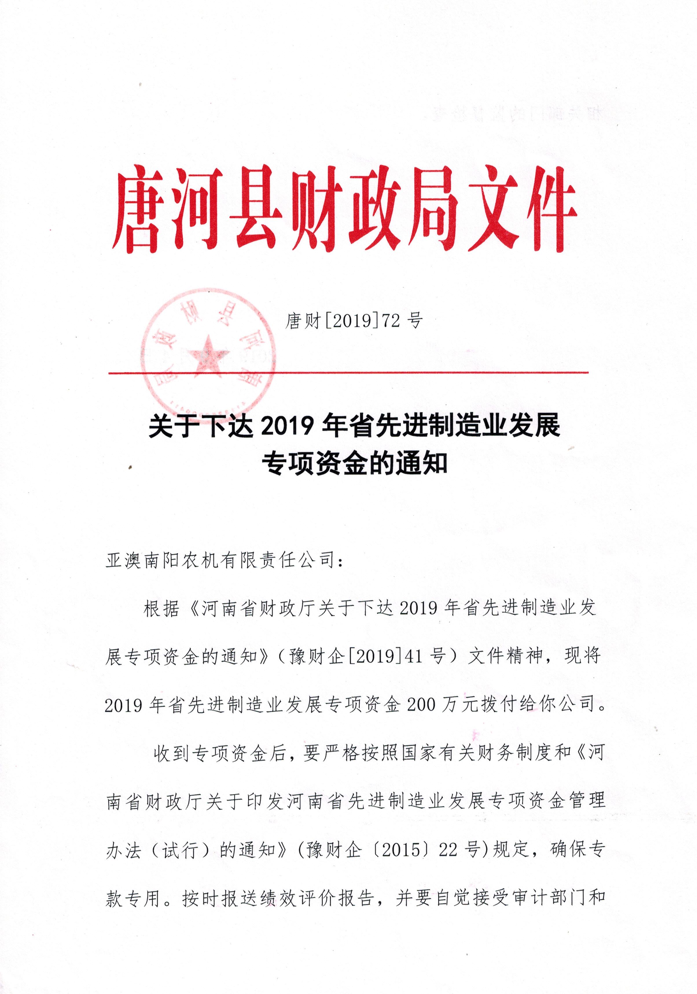 近日,國家工信部下達,河南省政府《印發(fā)<關于下達2019年省先進制造業(yè)發(fā)展專項獎金的通知》,對獲得先進制造業(yè)--國家綠色工廠的南陽市唐河縣亞澳南陽農(nóng)機有限責任公司的扶持專項資金200萬元下?lián)堋?/span>